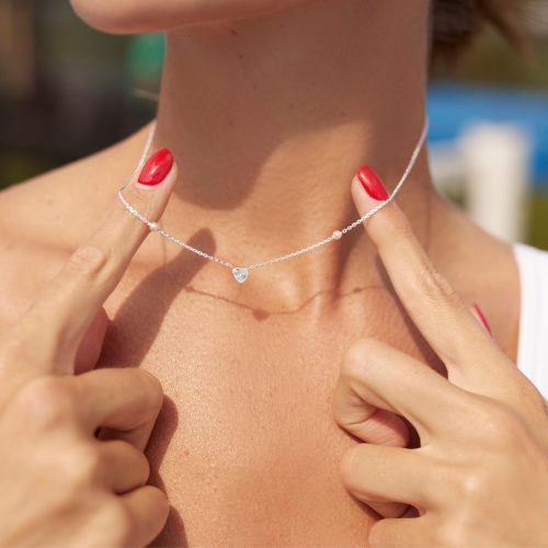 Delia nyaklánc különlegessége a szív alakú kő és a kis gyöngyök. Finoman megmunkált 925 Sterling ezüstből készült, tökéletes hétköznapi és alkalmi viselethez.