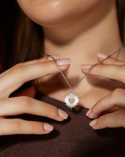Sun and Heart Sterling ezüst nyaklánc a nap és a fény szeretetét testesíti meg. Finoman kidolgozott nap forma ami egy kontúr szívet rejt magában.